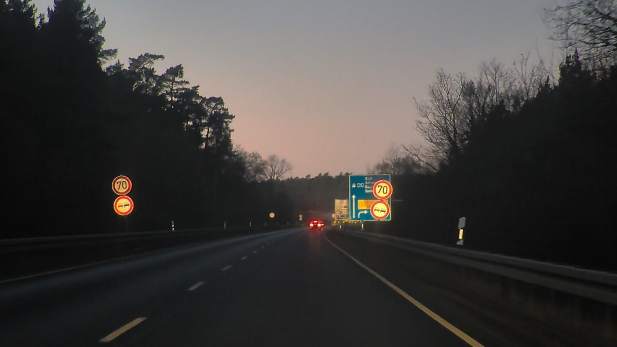 Der Anhänger der oberfränkischen Polizei steht an der B505 zu Beginn der Baustelle. Daher ist auf 50 km/h limitiert. Ein paar Monate vorher stand er rund 250m weiter unter der Brücke, die inzwischen abgerissen wurde.