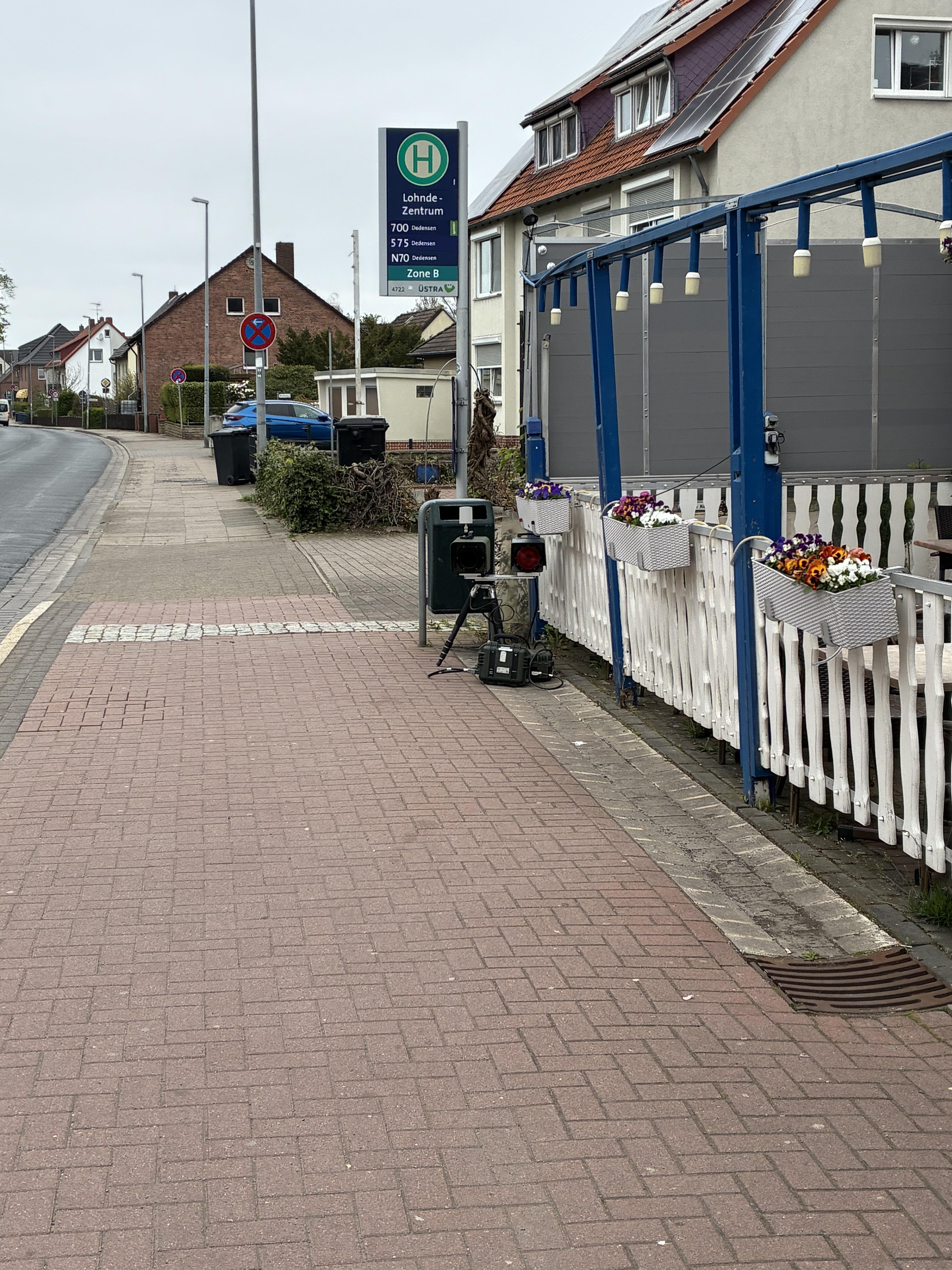 Steht unter dem Bushaltestellenschild "Lohnde Zentrum" vor dem Papierkorb. Überwachungsfahrzeug steht in der Gegenrichtung in der Seitenstraße.
