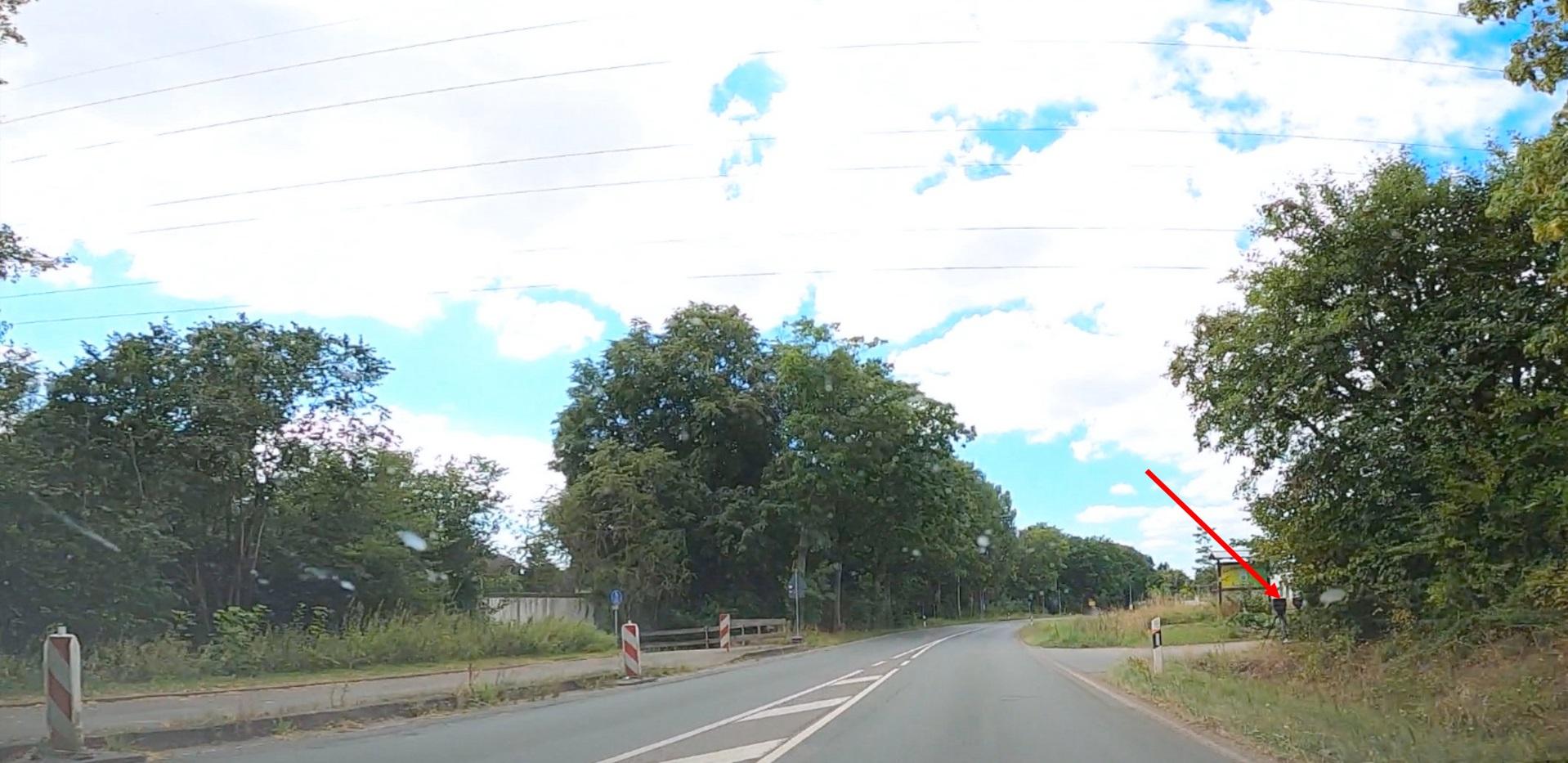 Landesstraße 3083 (Strother Straße): Fahrtrichtung Strothe. Der Messwagen ist auf dem Parkplatz des Kleingartenvereins abgestellt.