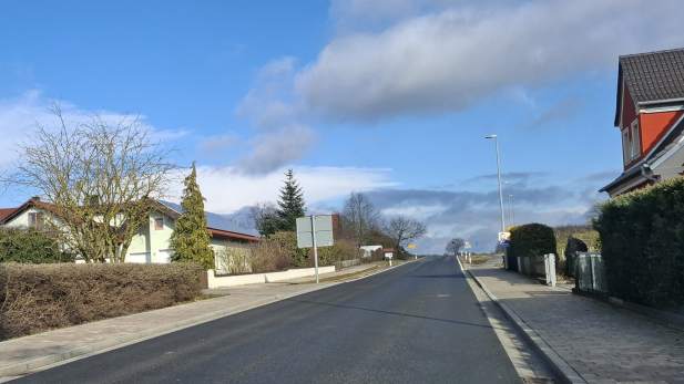 Ortsausgang Richtung Trosdorf, bei genauem Hinsehen kann man das Messgerät schon erkennen. Meistens wird auf dieser Höhe aber bereits geblitzt (Hecke rechts oder Grundstückseinfahrt links). Der Abstand zum Ortsschild ist daher deutlich geringer als normal... aber was will man sagen: genehmigt ist es.